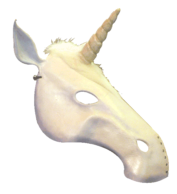 Leather and acrylic paint, plastic clay horn, artificial fur.